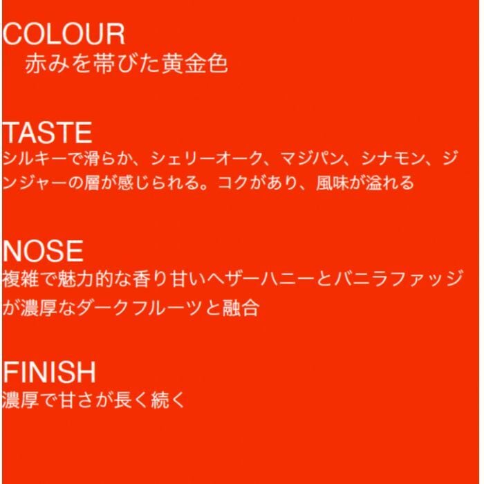 味わい:広がりのある滑らかさ・バニラ・シナモン・ほのかにスパイシー
